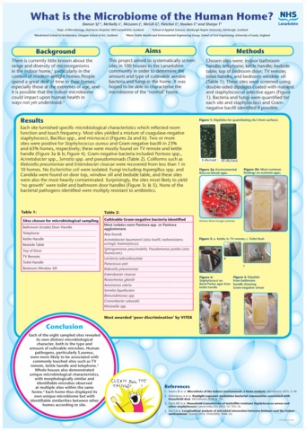 Dancer, Stephanie, McNally, Louise, McLaren, Janice, McGill, Grainne, Fletcher, Louise, Noakes, Cath and Sharpe, Tim (2018) What is the microbiome of the human home? In: Healthcare Infection Society Conference, 26-28 November 2018, ACC, Liverpool.