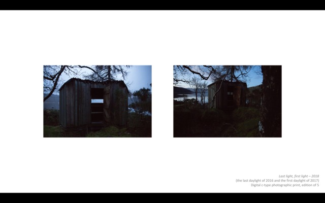 For some years (since 2014), I have made pairs of images in the last light of the last day of the year, and in the first light of the first day of a new year. I’m interested in how we perceive light and dark, and the transition between one state and another. This has become an on-going project where I 'collect' images from the end points of the calendar year. The process of gathering them is almost ritualistic. They are small, framed photographic works, where the point of interest is the comparison of two images of the same place separated by the length of a mid-winter night.