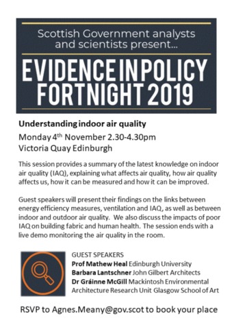 McGill, Grainne (2019) Indoor air quality and ventilation in homes. In: Evidence in Policy Fortnight 2019, 4 November 2019, Victoria Quay Edinburgh, Scottish Government.