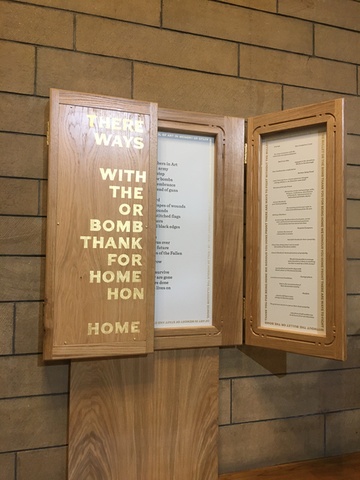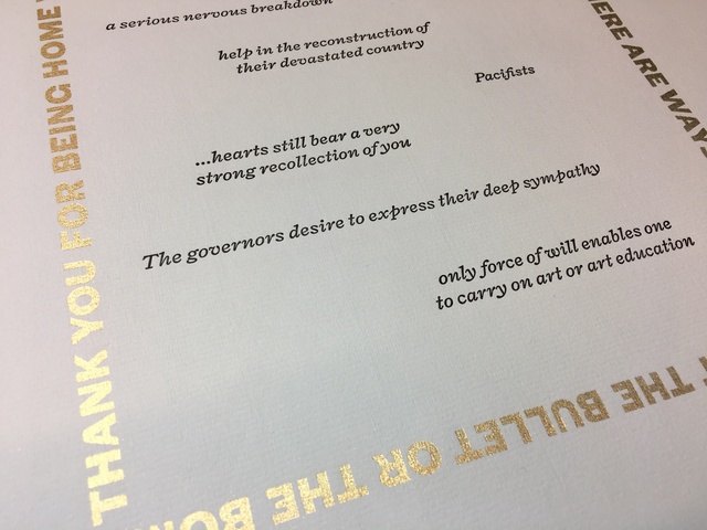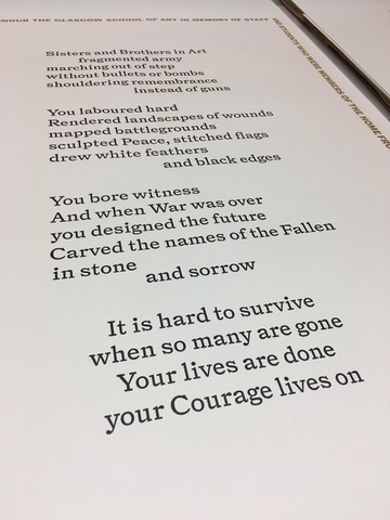 | Abstract: | To mark the centenary of the First World War, GSA Archives & Collections and Exhibitions have worked with Louise Welsh, Professor of Creative Writing at the University of Glasgow and Edwin Pickstone, GSA Lecturer, to create a memorial to GSA students, staff and governors who undertook work on the home front. Consisting of three panels with text written by Louise and letterpress prints created by Edwin, the memorial has been informed by archival research. Text taken from correspondence held with GSA archives meets an original written piece by Welsh. The design, informed by the process of selection from the archives is was arrived at by a careful study of letters and other documents from GSA collections and uses traditional craft techniques and materials analogous with the time period in combination with contemporary digital techniques. This memorial is a partnership piece to GSA’s WWI Roll of Honour, created in 1925 by Dorothy Doddrell to commemorate students, staff and governors who had served in the armed forces. The project has been generously funded by Mr James McBroom whose father James Nicol McBroom was a prize-winning student at the School and who undertook munitions work during the war. The First World War had a significant and lasting impact on families, organisations and communities. In the years after the war a huge number of memorials were created to commemorate the sacrifices of those who fought and those who fell including the GSA’s own memorial created by Dorothy Dodderell. At the same time thousands of people undertook vital work on the Home Front and this work is much less frequently remembered. On Armistice Day 2019 the GSA unveiled a memorial recognising the work of its staff and students who dedicated their lives to serving on the Home Front during WWI. With text by the acclaimed writer, Louise Welsh, and typography by Edwin Pickstone the three-panel work is inspired by material held in The Glasgow School of Art’s Archives and Collections. “For some time we had felt the GSA should mark the contribution of our staff and students who served on the Home Front,” explains Susannah Waters, Archives and Collections Manager “We were delighted to be able to work with the acclaimed writer, Louise Welsh, who is a former Writer in Residence at GSA, and Edwin Pickstone, lecturer, Typography Technician and Designer in Residence at GSA, to make this new memorial which will complement the Dorothy Dodderell memorial to all the GSA staff, students and governors who fought in WWI” “We are also very grateful to James McBroom who has generously supported the creation of the Home Front Memorial.” “The Glasgow School of Art, Home Front Memorial is inspired by GSA archives for 1914-19,” adds Louise Welsh. “The archives for those years are interspersed with letters and death noticed on black edged paper. Nevertheless the voices of students and staff of the era feel alive. The people of the Home Front lived in desperately challenging times. They responded with courage, gravity, hard work and imagination. Their hopes and dreams mirror those of staff and students I work with today. It has been a privilege to read and respond to their words.” The memorial was unveiled by James McBroom whose father had been one of those GSA students who had worked on the Home Front in WWI. James Nicol McBroom, had been a student at the GSA from 1914-1917. Unable to go on active military duty due to ill health, James was assigned to munitions work during the war. “My father was a student at The Glasgow School of Art from 1915-1917and also served on the Home Front during the first world war,”says James McBroom. “His health wasn’t good during the war and he wasn’t accepted for military service. Instead he was redirected to munitions work at Alexander Finlays, so he helped from the Home Front.” “I’ve been following the Archives work on this project for the last five years and I’m delighted by the memorial. I think it is a fitting tribute to people from The Glasgow School of Art who were involved on the Home Front like my father.” The Home Front Memorial will be on show initially in the chapel at Glasgow University where Louise Welsh is Professor of Creative Writing. It will then come home to The Glasgow School of Art as a partner to the Dorothy Dodderell memorial. To mark the centenary of the First World War, GSA Archives & Collections and Exhibitions have worked with Louise Welsh, Professor of Creative Writing at the University of Glasgow and Edwin Pickstone, GSA Lecturer, to create a memorial to GSA students, staff and governors who undertook work on the home front. Consisting of three panels with text written by Louise and letterpress prints created by Edwin, the memorial has been informed by archival research. The frame was designed and made by Steven Higgins with lettering from Erin Bradley-Scott. This memorial is a partnership piece to GSA’s WWI Roll of Honour, created in 1925 by Dorothy Doddrell to commemorate students, staff and governors who had served in the armed forces. The project has been generously funded by Mr James McBroom whose father James Nicol McBroom was a prize-winning student at the School and who undertook munitions work during the war. |