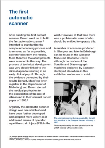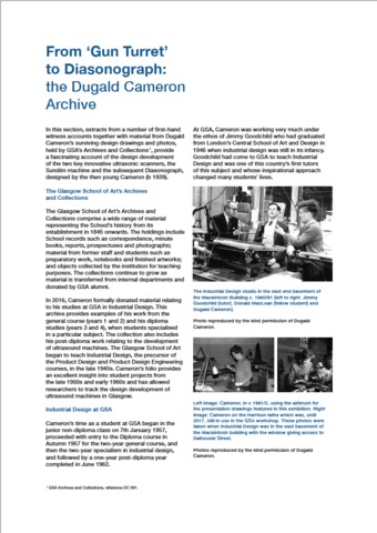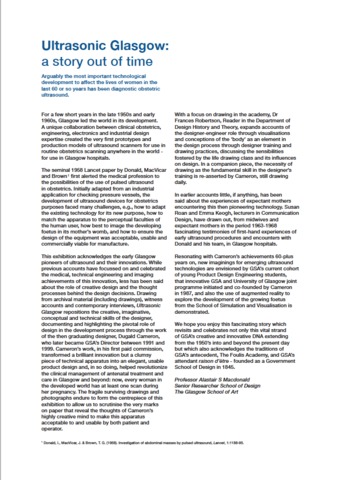 Arguably the most important technological development to affect the lives of women in the last 60 or so years has been diagnostic obstetric ultrasound. For a few short years in the late 1950s and early 1960s, Glasgow led the world in its development. A unique collaboration between clinical obstetrics, engineering, electronics and industrial design expertise created the very first prototypes and production models of ultrasound scanners for use in routine obstetrics scanning - anywhere in the world - for use in Glasgow hospitals. A seminal 1958 Lancet paper by Donald, MacVicar and Brown first alerted the medical profession to the possibilities of the use of pulsed ultrasound in obstetrics. Initially adapted from an industrial application for checking pressure vessels, the development of ultrasound devices for obstetrics purposes faced many challenges, e.g., how to adapt the existing technology for its new purpose, how to match the apparatus to the perceptual faculties of the human user, how best to image the developing foetus in its mother’s womb, and how to ensure the design of the equipment was acceptable, usable and commercially viable for manufacture. The exhibition Ultrasonic Glasgow, held at The Glasgow School of Art (GSA) in October 2019, acknowledged the early Glasgow pioneers of ultrasound and their innovations. While previous accounts focussed on and celebrated the medical, technical engineering and imaging achievements of this innovation, less has been said about the role of creative design and the thought processes behind the design decisions. Drawing from archival material (including drawings), witness accounts and contemporary interviews, Ultrasonic Glasgow repositioned the creative, imaginative, conceptual and technical skills of the designer, documenting and highlighting the pivotal role of product design in the development process through the work of the then graduating designer, Dugald Cameron, who later became GSA’s Director between 1991 and 1999. Cameron’s work, in his first paid commission, transformed a brilliant innovation but a clumsy piece of technical apparatus into an elegant, usable product design and, in so doing, helped revolutionize the clinical management of antenatal treatment and care in Glasgow and beyond: now, every woman in the developed world has at least one scan during her pregnancy. The fragile surviving drawings and photographs formed the centrepiece of this exhibition to allow us to scrutinise the very marks on paper that reveal the thoughts of Cameron’s highly creative mind to make this apparatus acceptable to and usable by both patient and operator. Other elements of the exhibition represented current design and scholarly activity across GSA. With a focus on drawing in the academy, Dr Frances Robertson, Reader in the Department of Design History and Theory, expanded accounts of the designer-engineer role through visualisations and conceptions of the ‘body’ as an element in the design process through designer training and drawing practices, discussing the sensibilities fostered by the life drawing class and its influences on design. In a companion piece, the necessity of drawing as the fundamental skill in the designer’s training was re-asserted by Cameron. In earlier accounts little, if anything, has been said about the experiences of expectant mothers encountering this then pioneering technology. Susan Roan and Emma Keogh, lecturers in Communication Design, drew out, from midwives and expectant mothers in the period 1963-1968, fascinating testimonies of first-hand experiences of early ultrasound procedures and encounters with Donald and his team, in Glasgow hospitals. Resonating with Cameron’s achievements 60-plus years on, new imaginings for emerging ultrasound technologies were envisioned by GSA's young Product Design Engineering students, that innovative GSA and University of Glasgow joint programme initiated and co-founded by Cameron in 1987. In highlighting the innovative applications of augmented reality from GSA’s School of Simulation and Visualisation, Koegl’s digital modelling revealed, in interactive 3D, the development of the foetus in the stages before birth. In the preparation and lead-up to - and during - the exhibition, a number of related events took place. Due to the renewed interest in his work, GSA organised a public lecture ‘Making Waves’ by Cameron at the Royal College of Physicians and Surgeons in November 2018. Due to Cameron’s lobbying to celebrate the 60th anniversary of Donald, MacVicar and Brown’s Lancet paper, a motion, put forward by Angela Constance MSP, was debated in the Scottish Parliament in November 2019 to celebrate this Scottish innovation. As a part of Roan and Keogh’s related Human Echoes research, a number of those women who had been scanned, in Glasgow, by this technology, attended both the opening of - and a special event during – the exhibition. An article has been published in the journal Ultrasound, entitled: 'From first concepts to Diasonograph: the role of product design in the first medical obstetric ultrasound machines in 1960s Glasgow'. |