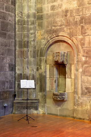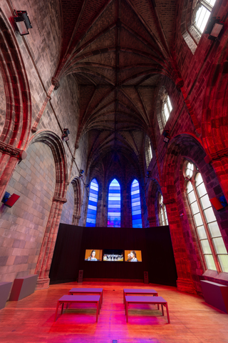 | Abstract: | Triptych, Trinity Apse, Edinburgh Art Festival Triptych, a new work for Edinburgh Art Festival in the historic context of Trinity Apse, is, as the title suggests, tripartite in structure, producing a space where moving image, colour and music correspond and resonate with historical and contemporary architectural, poetic and political contexts. At the heart of Triptych is a three-channel film documenting a performance of Henryk Gorecki’s Symphony No. 3: Symphony of Sorrowful Songs (1976) in the Megaron Concert Hall, Athens. Conceived for documenta 14, the concert was performed by the Athens State Orchestra with the Syrian Expat Philharmonic Orchestra (founded in 2015 by Raed Jazbeh) and featuring Syrian soprano, Rasha Rizk. Gorecki’s Symphony of Sorrowful Songs is a moving lament, reflecting the experience of loss as a result of war. A sense of separation and absence pervades the film installation. A central screen documents a wide view of the orchestra and conductor, Daniel Raiskin, while two side panels appear to focus upon an empty space – a space which awaits the solo performance of Rizk. Rizk recites a 15th century lament from the Songs of Lysagora. Sited in the remnants of a 15th church, this is one of several contexts that permeate Birrell and Harding’s Triptych. In its formal presentation, the film references another triptych – Hugo Van der Goes’ Trinity Altarpiece (1478-79), painted for the original Trinity Church and now housed in the National Gallery of Scotland. Alongside Gorecki, the Athens concert also included a performance of Fugue, a project developed by Ross Birrell in collaboration with the Syrian composer and violinist, Ali Moraly. Fugue shares the same etymology as refugee, and in an echo of the subject and countersubject which characterizes contrapuntal fugal form, an initial theme was sent by Birrell to Moraly inviting a response which ultimately took the form of Moraly’s Quatrain for Solo Violin after Paul Celan’s Death Fugue. The scores which combine to form Fugue are exhibited as part of Triptych. Visitors to Trinity Apse were met by an infusion of colour emanating from new compositions created in reds and blues for windows long devoid of their original stained glass. These chromatic mosaics are based on fragments of a further music score which has its origins in lines by the Palestinian poet, Mahmoud Darwish, whose words are transposed into a twelve-tone musical notation and corresponding numerical grid, and subsequently translated into fields of red and blue colour tones. The complex transposition of forms enacted in Triptych – live recital into film, poetry into music, music into colour – corresponds to wider cultural conditions of exile, migration, displacement and fragmentation; and finds echoes in the architectural fabric of Trinity Trinity Apse is all that remains of the original Trinity Collegiate Church, taken down in 1848 to make way for Waverley Train Station. In an early example of heritage conservation, the stones were numbered with a view to rebuilding the church on an alternative site. Some 30 years later, fragments of the choir and a transept were re-erected on the current site to form Trinity Apse. Still bearing evidence of their painted numbers, a visible testament to their displacement and re-siting, the stones of Trinity Apse provide a fitting context for a work reflecting on loss, trauma and exile. The commission by Edinburgh Art Festival of the installation in Trinity Apse also provided the context for the organisation of two concerts. The first a solo recital by Ali Moraly in Trinity Apse, Friday 24 August 2018 and the second Keep me like the echo, hosted by the Scottish Parliament, Saturday 25 August 2018. Keep me like the echo featured a recital by the Damascus String Quintet of SEPO, with Rasha Rizk, and a recital by Ali Moraly of Fugue and also new work with Rasha Rizk and members of the GSA Choir. |