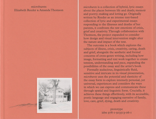 | Abstract: | microbursts is a collection of hybrid, lyric essays about the places between life and death; memoir and poetry; making and letting go. Originally written by Reeder as an intense text-based collection of lyric and experimental essays responding to the illnesses and deaths of her parents, it confronts the raw emotions of crisis, grief and creativity.Through collaboration with Thomson, the project expanded to consider how design and visual intervention might alter the nature and impact of the text. The outcome is a book which explores the subjects of illness, crisis, creativity, caring, death and grief, alongside the aesthetic and formal concerns of cross-genre writing, including how image, formatting and text work together to create tension, understanding and pace, expanding the possibilities of the essay and the artist’s book. Formally audacious, linguistically fluid, sensitive and intricate in its visual presentation, microbursts uses the potential and elasticity of the essay form to explore intensely personal, yet universal, experiences and considers the ways in which we can express and communicate these through spatial and linguistic form. Crucially, it achieves these things effortlessly, with its accessible, poetic language and engaging narrative of family, love, care, grief, dying, death and creativity. Microbursts is part of Prototype Publication's Type 3// Interdisciplinary Projects strand: 'the natural evolution of the flexible approach we take to poetry and prose. A response to the exciting and necessary demand for interdisciplinary and collaborative publications which require new and innovative ways of thinking about writing and publishing.' |