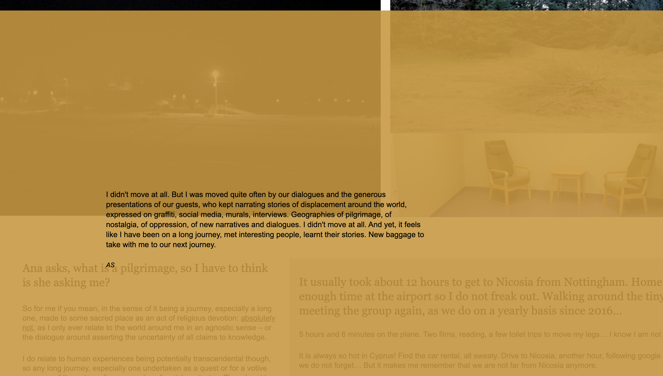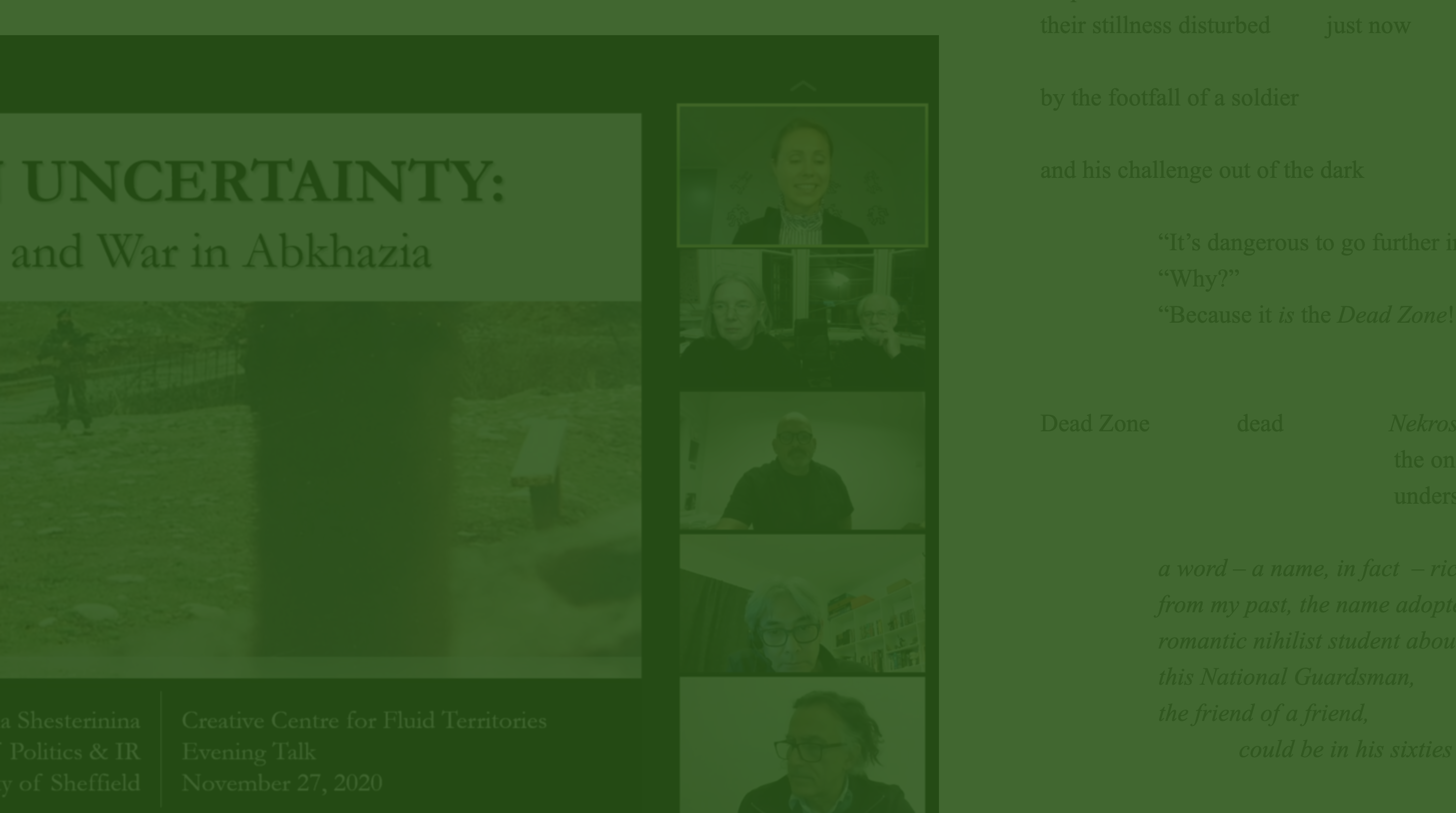 Nine members of the international interdisciplinary research group, the Creative Centre for Fluid Territories’ (CCFT) contributed to Cyprus Buffer Fringe 2020, through a collaborative project: Fluid Territories – Nomadic on-line dialogue: Belonging & Displacement. This took two forms: an online exhibition created through a unique dialogical and negotiated creative exchange, between internationally dispersed contributors, on-line via weekly meetings over a period of 2 months, disseminated within a dedicated web portal in the public domain (Research Catalogue); and working with invited, interdisciplinary voices to create a series of online, live, ‘Travelling Colloquia’ with invited participants (Oct-Nov 2020), engaging in a dialogue about place, belonging and displacement, refocused and highlighted in response to the unfolding conditions created from COV-19. All culminating in three events for Cyprus Buffer Fringe VII, 2020. Building on our contribution to Cyprus Buffer Fringe 2019, ‘The Urban Glenti’ [Urban Feast], CCFT members, along with invited other voices, creative practitioners, educators and cultural producers contributed, shared, expanded and explored the Cyprus Buffer Fringe 2020’s theme of ‘Belonging and Displacement’ with the Research Catalogue acting as a container of dialectic thoughts, and the live events that formed part of the Buffer Fringe’s programme, a dynamic space of dialogue. The intention being that the whole practice-led and dialogical process be read as a series of inter-related ideas, critical positions and visual relationships, and as a durational response exploring the concepts of place, belonging and displacement. CCFT Nomadic Online Dialogues (weekly throughout Oct-Dec 2020) CCFT Travelling Colloquia with invited participants (Oct-Nov): 16 October 2020: Ellada Evangelou of the Home4Cooperation (NGO focused on intercommunal dialogue) 30 October 2020: Alex Hale, Archaeologist, Edinburgh on ‘Archaeology of the Contemporary’. 6 November 2020: Vasilis Vasiliou, Street/Graffiti Artist working either side of the Buffer Zone in Nicosia, Yiannis Toumazis, Director of NIMAC, research based in abandoned architectural space of Famagusta, and Alex Hale, Archaeologist. 20 November 2020: Jenny Brownrigg, Director of Exhibitions, GSA. ‘Research Displacement’: discussing her research into the photographs of Margaret Fay Shaw based on Canna, and her connections with Cyprus. 27 November 2020.: with Dr Anastasia Shesterinina, Dept of Politics & International Relations, University of Sheffield, ‘Mobilizing in Uncertainty: Collective identities and war in Abkhazia . Buffer Fringe VII 2020 Events – Contributions and Responses to CCFT Nomadic online dialogues: 3 December 2020: Anastasia Shesterinina Despo Pasia (Museum Educator based in Cyprus) Vasilis Vasiliou Alex Hale 5 December: Helen Angell-Preece (PhD researcher, Glasgow School of Art) Noah Rose (PhD researcher, Glasgow School of Art) Emily Gray (PhD researcher, Nottingham Trent) Andrew Lock (PhD researcher, University of Bergen) 6 December: Ellada Evangelou Catherine van Olden Maria Varanakkidou Monica Day Carmen Olaechea Home4Cooperation Anastasia Shesterinina |