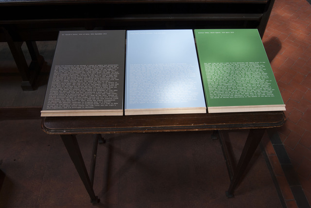 | Abstract: | ‘Peregrini’ is a collaborative text-based, site-specific, work derived from visits to pilgrim sites in Scotland, Finnish Sámi-land and North Cyprus - significant to Christians, Samis and Muslims, respectively - presented as a topographic triangulation of these sites within the architecture of Govan Old Church: the land now occupied by the church being a significant former pilgrim location. Viewers were invited to move from text to text, distributed across architectural space – moving from place to place – metaphorically pausing on their journey between places that have accrued spiritual significance in the external world. At each stopping point, arriving at different sites and states on an internal journey. The installed work was made for a group exhibition and related conference, both under the same title, ‘Pilgrims and Pilgrimage: Sights and sounds of the sacred’. While pilgrimage may be defined as a mode of journeying towards a highly significant focus or goal – a shrine or other sacred place – in its broadest sense, it is also a journey undertaken for reasons of curiosity or as a matter of sentiment. What also characterises pilgrimage is the form and effect of the journey, which often takes the traveller or pilgrim out of their conventional and habit world into a kind of liminality, or in-between place, that leads to a transformative state. In this installation, the states of ‘the stranger’, ‘the wanderer’ and ‘the exile’. The work comprises: |