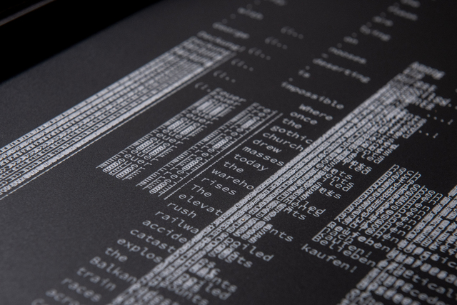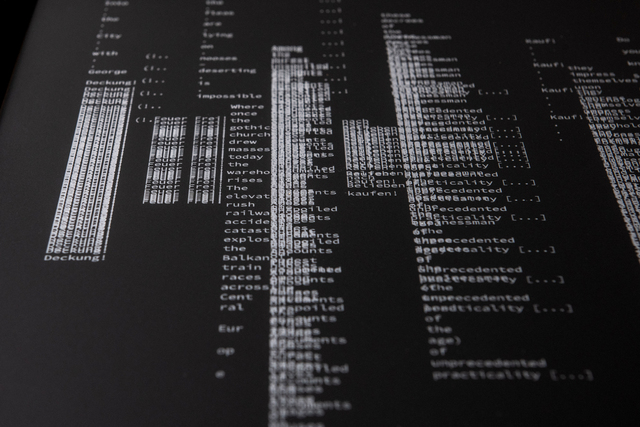 This work revisits an issue of Neue Jugend published in Berlin in June 1917 under the creative direction of John Heartfield and George Grosz. Outspoken in their criticism of both the war and bourgeoise salon art, the pair had, by this time, formed a dynamic, creative alliance; anglicised their names in protest against the prevailing anti-English sentiments and, along with Hülsenbeck, Höch and Hausmann, introduced Dada into Berlin. The June issue, which would prove to be the last, was published a month after Grosz had been discharged from the front, and his written contributions offer hint of a troubled soul grappling with the sharp edges of modernity. Set in a variety of typefaces, weight, and colour, Heartfield's handling of Grosz's essays could be interpreted as a celebration of the city, yet suggest, on a deeper level, a sharing of trauma; the suggestion that both were traumatophiles seeking to avert shock through the creation of shock. As a child, Heartfield and his three siblings had been abandoned in a forest by their parents, who they were never to see again. Raised by a local family, John was a lover of the countryside, yet prone to bouts of sudden anger: a trait he was to channel into his work. In contrast, Grosz was suave, urbane, and comfortable in the city. Yet, when he returned from the front, he would reflect how life in the trenches had 'split his nerves in two.' The format is derived from a double-page spread of Neue Jugend, as it may have sat on the print bed, with the 'American' format of 640x520mm larger than the ubiquitous Berliner. The left-hand page - into the forest with John - adopts the structural form of a familiar Brothers Grimm story and is built from fragments of text, with sources including Schiller, Goethe, Goebbels, Breton, and Tzara, as well as a well-known German nursery rhyme. Set in code, it anticipates how Heartfield and Grosz - both pioneers of emerging technology – might handle such content today. The right-hand page - into the city with George - presents passages from the Grosz essays published in the June issue: Kannst du radfahren? (Trans. Can you ride a bicycle?) and Man muß Kautschukmann sein! (Trans. You have got to be a rubber man!). In these texts, Grosz calls forth the future artists: those 'rubber' men and women adept at navigating the city, adapting the signs and strategies of advertising to their own, politically charged agenda. |