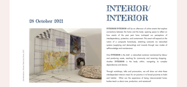 INTERIOR/INTERIOR was an afternoon of online events that explored connections between the home and the body: opening space to reflect on how events of the pandemic have re-shaped our perceptions of interdependency, protection, and containment. This event expanded upon the notion of a composite home-body, stretching outwards via networked systems (supplying and demanding) and inwards through new modes of self-knowledge and maintenance. One INTERIOR is the shell - a networked container maintained by labour and producing waste, reaching for community and receiving shopping. Another INTERIOR is the body within, navigating its complex dependencies and desires. 'Through workshops, talks and provocation, we will draw out what these interdependent interiors mean for art practice in its forced proximity to habit and habitat. What can the experience of being interconnected home-bodies teach us about care, production, and resistance?' INTERIOR/INTERIOR was curated by Dr Zoë Mendelson (artist and Head of Painting and Printmaking at The Glasgow School of Art) and Anna Bunting-Branch (artist and Associate Lecturer, Camberwell College of Arts). The event consisted of 3 parts: PART 1: CALLING OCCUPANTS: Artists and writers share their responses to a series of provocations that emerge from the themes of INTERIOR/INTERIOR. Hosted by Anna Bunting-Branch and Zoë Mendelson, with space for questions and discussion. Artist-contributors: Marita Fraser; Hazel Meyer; Hylozoic/Desires (Himali Singh Soin & David Soin Tappeser); Nastja Säde Rönkkö; Xiuching Tsay PART 2: The virus and the expanded field: Dr. Zoë Mendelson will present new research into the virus as metaphor, considering applied uses for an examination of its spread, mutation and its ambitions. Drawing on expanded field art practice and the medical, this research uses models from art practice to consider how the site of the pandemic home has become an escape from the viral but also sits in the shadow of its most stark metaphors. Our homes, connected via electricity and forms of commodified exchange, now produce (work, economics) as well as consume, forming buzzing cartographic global drawings stitching domestic spaces to each other across the world. Mendelson shielded for 59 weeks from March 2020 and draws on her experience of the home-as-skin suggesting how wellbeing as a success narrative dissolves the values of productive vulnerability. PART 3: Recipes for Disaster 17.30 - 19.30 Recipes for Disaster will be for up to 20 participants and will include live presentation and break out rooms, with the option to publish your recipe in the event archive. In this creative writing workshop, we will explore ways to prepare, create and transform in the face of disaster: from personal and political heartbreak to austerity, illness, climate emergency, and whatever else the future may have in store. Thinking about the recipe as a minor genre that embraces both practical instruction and wonderous alchemy, we will write our own recipes for disaster that mix ingredients for sustenance, indulgence, survival and insurrection. Recipes for Disaster will be led by Anna Bunting-Branch, drawing on her ongoing research into feminist science fiction. |