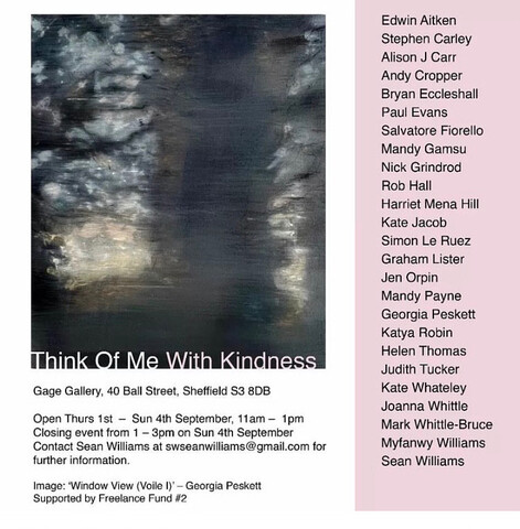 | Abstract: | Think Of Me With Kindness Curated by Sean Williams Gage Gallery Mowbray Street, Sheffield, United Kingdom 1st – 4th September 2022 ___ Gallery Text Think Of Me With Kindness' is an exhibition of 25 small artworks celebrating picture-making in all its forms - from pure abstraction, through collage, photo-realism to objects on the edge of sculpture 'Think Of Me With Kindness' is an exhibition, at Gage Gallery in Sheffield, of 25 small artworks celebrating picture-making in all its forms - from pure abstraction, through collage, photo-realism to objects on the edge of sculpture. It features artists who have all generously contributed to the Prosaic micro-exhibitions over the past two years - Edwin Aitken, Stephen Carley, Alison J Carr, Andy Cropper, Bryan Eccleshall, Paul Evans, Salvatore Fiorello, Mandy Gamsu, Nick Grindrod, Rob Hall, Harriet Mena Hill, Kate Jacob, Simon Le Ruez, Graham Lister, Jen Orpin, Mandy Payne, Georgia Peskett, Katya Robin, Helen Thomas, Judith Tucker, Kate Whateley, Joanna Whittle, Mark Whittle-Bruce, Myfanwy Williams, Sean Williams. Curated by Sean Williams. Thursday 1 September - Saturday 3 September, 11am - 1pm ___ An exhibition orchestrated by Sean Williams, an established Sheffield-based curator, featuring 25 invited artists. Each artist had previously taken part in a micro exhibition at Bloc Studios in Sheffield – which were established by Williams to offer up new dialogues between disparate approaches to contemporary painting. I was invited to exhibit one of an ongoing (at that time) series of works focused on surface, the fragment, proximity and distance. In Bits of Sellotape Left on the Wall, various ideas related to how a viewer can be ‘pulled’ toward a surface, to pause and to examine traces and remainders of pushed and pulled paint were foregrounded. |