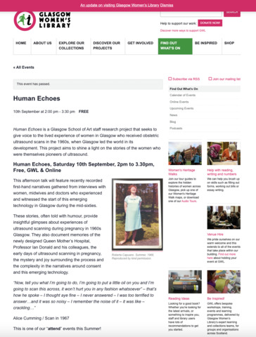 Roan, Susan and Keogh, Emma (2022) Human Echoes / Ultrasonic Glasgow: Audio and Visual Presentation in person and online. In: Human Echoes / Ultrasonic Glasgow Presentation, 10th September 2022, The Glasgow Women's Library.