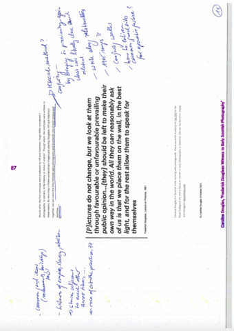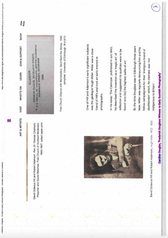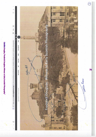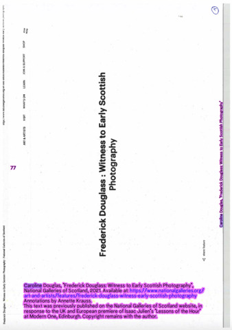 | Abstract: | 'Frederick Douglass : Witness To Early Scottish Photography' has been published in one of three forthcoming Common Good Study Resource zines produced by Annette Krauss for her exhibition 'A Matter of Precedents' at the Collective, Edinburgh, 2023. Zine 2 pg 77-87 In 2020 I published two texts on Frederick Douglas and his connections to early Scottish Photography (see https://radar.gsa.ac.uk/8900/ and https://radar.gsa.ac.uk/8899/) The article commissioned and published by the National Galleries of Scotland has been republished in one of three forthcoming Common Good Study Resource zines for the Collective in Edinburgh, 2023 (May 2023). In summer 2022, Collective presented three new, distinct artist commissions across the City Observatory site and online. Using the City Observatory site as a springboard, Collective’s programme considered the hidden histories and untold stories relating to our site and wider cultural history. Bringing together new work by Annette Krauss, Ruth Ewan, and Satellites participant Camara Taylor, our summer programme of solo exhibitions and related events reframed and questioned complex figures, movements and systems whose legacies are woven into our collective cultural memory. All three projects were developed with the artists, in some cases over a number of years, to explore how the legacies of the past can be reconsidered and re-presented to help us re-imagine the present and future. A Matter of Precedents Artist, educator, and writer Annette Krauss has been working with Collective over several years on A Matter of Precedents, a research project exploring the ‘common good’. Annette’s collaborative work is dedicated to practices of ‘unlearning’ and ‘commoning’, addressing questions of institutional responsibilities, feminism, and privilege. A Matter of Precedents examined the City Observatory’s status and designation as a ‘common good asset’ and was developed in dialogue with a number of people involved in Collective’s redevelopment of the site, alongside artists and cultural thinkers. The ‘common good’ is a form of collective property, unique to Scotland, comprising buildings, land, structures, and monuments gifted to the people of a specific area. Categorised as ‘common good’, these items are today managed by local councils and their partners for the good of the people. Developing on Annette’s long-term research on the commons, A Matter of Precedents considered the specificity and lack of visibility of the Scottish commons, particularly in Edinburgh; and draws on Collective’s journey to the City Observatory as a way to study the (imaginative) potential of the ‘common good’ as a particular legal, historically philanthropic, early capitalist anomaly entangled with colonial histories. In the face of the increasing pressures of commercialisation and privatisation of public space in our cities, A Matter of Precedents sought to understand the obligations, responsibilities, and restrictions around the use of common good items as opportunities for public agency. A research resource was presented in Collective’s City Observatory Library, with an online presentation launching in 2023. Materials have been brought together to demystify and expose some of the legal mechanisms and institutional processes around publicly owned items. The resource includes a map of the common good sites in Edinburgh, based on the 2018/19 and 2020/21 Edinburgh City Council Common Good Registers; and interviews with those involved in Collective’s particular activation of the common good, alongside artists and cultural thinkers who have encountered issues surrounding the common good in their own communities and work. The three zines act as a record of the project, a sort of reader, and as a resource for further study: holding transcripts of recorded conversations, previously published articles, and two new writings. Much of this gathers in printed form the contributions made for a display in the library at Collective which was in place during the summer, whether that be audio interviews or material added to a Study Board, and those offered as part of public walks that happened in May around common good items. Many of the common good statues and buildings connect to histories and figures whose legacies are connect to colonialism. My work has been included to make connections in space/ time between historical figures, especially Frederick Douglass and the Free Church of Scotland. |