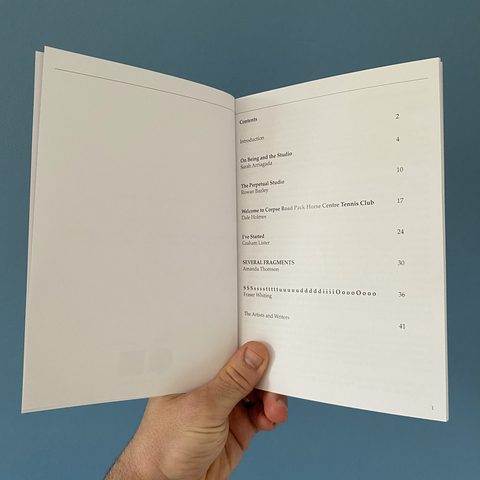 | Abstract: | ‘Studios are spaces where artists make and think and talk and write. Where they look and succeed and fail and eat and sleep and start afresh and draw and paint. Where they read and rest and work and don’t work …’ ‘Fragments and False Starts features essays from 6 artists, each reflecting on how they might think about, or use, a studio.’ __ Fragments and False Starts was a body of practice-based research which was more than a year in the making. It was funded by Creative Scotland which allowed for a new publication to be brought together. This publication included new, commissioned essays by national and international artists, at various stages of their careers The publication took the form of a soft-bound book and was published and distributed as part of the exhibition Fragments and False Starts [Radar 9213]. 5 artists were commissioned to write new texts which were built around reflections on their relationship with their studios. The artists invited to contribute were: Sarah Arriagada (USA), Rowan Bazley (England), Dale Holmes (England), Amanda Thomson (Scotland) and Fraser Whiting (Scotland). Sarah Arriagada, ‘On Being and the Studio’ __ These artists are all practitioners whose working methods were of specific interest to me. From home studios to encompassing walking in the Highlands, to disused shopping centres, the publication highlighted the physical and mental spaces which we can understand as ‘studios’. I also contributed an essay about my own understanding of studio-working at present, and wrote the introduction to the publication.. The publication was distributed widely – available for free to more than 200 visitors to the exhibition at Studio pavilion in Glasgow. A number of publications were distributed to the writers for their own networks and posted to individuals and organisations who requested them through social media. Furthermore, it was available on issuu as a free to download online publication. |