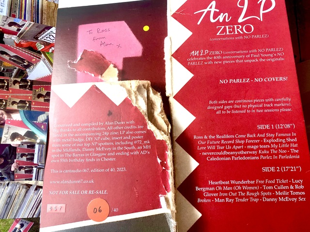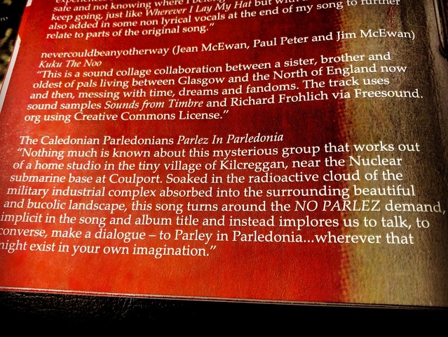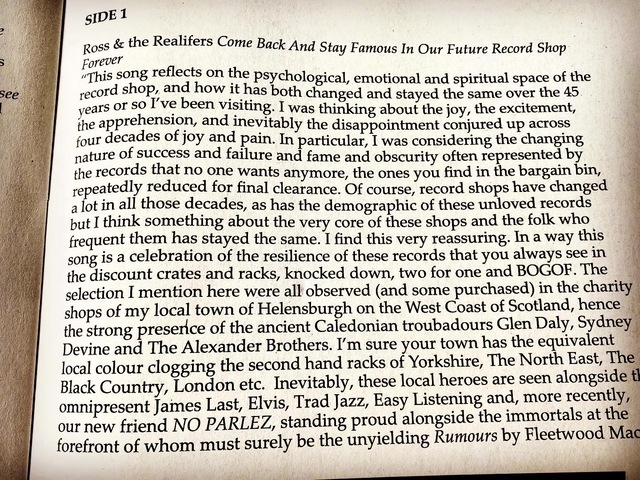 Come Back and Stay Famous in our Future Record Shop Forever. (3:00) Ross & the Realifers (written, recorded, performed by Ross SInclair) This song reflects on the psychological, emotional and spiritual space of the record shop, and how it has both changed and stayed the same over the 45 years or so I’ve been visiting. I was thinking about the joy, the excitement, the apprehension, and inevitably the disappointment conjured up across 4 decades of joy and pain. In particular, I was considering the changing nature of success and failure and fame and obscurity often represented by the records that no one wants anymore, the ones you find in the bargain bin, repeatedly reduced for final clearance. Of course, record shops have changed a lot in all those decades, as has the demographic of these unloved records but I think something about the very core of these shops and the folk who frequent them has stayed the same. I find this very reassuring. In a way this song is a celebration of the resilience of these records that you always see in the discount crates and racks, knocked down, two for one and BOGOF. The selection I mention here were all observed (and some purchased) in the charity shops of my local town of Helensburgh on the West Coast of Scotland, hence the strong presence of the ancient Caledonian troubadours Glen Daly, Sidney Devine and The Alexander Brothers. I’m sure your town has the equivalent local colour clogging the second hand racks of Yorkshire, The North East, The Black Country, London etc. Inevitably, these local heroes are seen alongside the omnipresent James Last, Elvis, Trad Jazz, Easy Listening, more recently, our new friend No Parlez, standing proud alongside the immortals at the forefront of whom must surely be the unyielding Rumours, by Fleetwood Mac. Is it true the current vinyl shortage is caused by multiple record plants in the USA churning these bad boys out 24/7? If you have ever visited a second-hand record shop in the UK, you would definitely believe that this could be the true. Parlez in Parledonia (2:17) The Caledonian Parledonians (written, recorded, performed by Ross SInclair) Nothing much is known about this mysterious group that works out of a home studio in the tiny village of Kilcreggan, near the Nuclear submarine base at Coulport. Soaked in the radioactive cloud of the military industrial complex absorbed into the surrounding beautiful and bucolic landscape, this song turns around the No Parlez demand, implicit in the song and album title and instead implores us to talk, to converse, make a dialogue – to Parley in Parledonia...wherever that might exist in your own imagination. |
