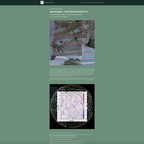 That's What the Bucket is For was a soundwork and radio broadcast commissioned for Radiophrenia 2023. It is the beginnings of a radiophonic fiction by Alison Scott, Becky Sik and Rosie Roberts. The work generates and dissolves an amorphous identity who sifts through data and is transfixed and subsumed by facts, stories and observations. The collaboration is informed by an improvisational 'scrapbook' approach to science fiction-making. A fragmentary narrative emerges from intuitive responses to both immediate environments and a rangey lot of matter the trio collected surrounding the theme of orbits. The result is a giddy selection of moving people, places and objects created through spinning, looping and reading in each other's presence, expressed through music, narration, field recordings, and transcription.