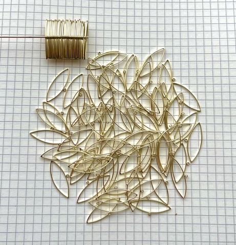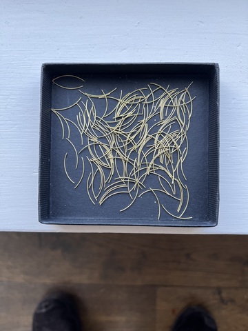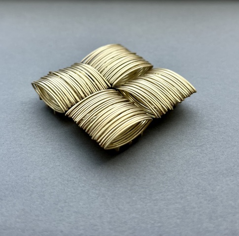 Looking at embroidery techniques and how these can be translated into 3 dimensional pieces of metalwork, This piece explores satin stitch The repeated forms in wire and the drawn quality of the threads are explored in the brooch in 18 carat yellow gold wire. This work has been developed in the drawing threads research cluster at GSA.