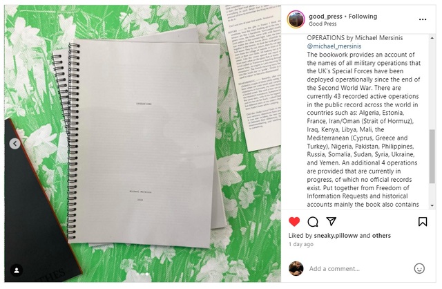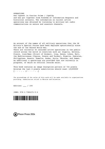 | Copyright and Open Access Information: | The bookwork provides an account of the names of all military operations that the UK’s Special Forces have been deployed operationally since the end of the Second World War. There are currently 43 recorded active operations in the public record across the world in countries such as: Algeria, Estonia, France, Iran/Oman (Strait of Hormuz), Iraq, Kenya, Libya, Mali, the Mediterranean (Cyprus, Greece and Turkey), Nigeria, Pakistan, Philippines, Russia, Somalia, Sudan, Syria, Ukraine, and Yemen. An additional 4 operations are provided that are currently in progress, of which no official records exist. Put together from Freedom of Information Requests and historical accounts mainly the book also contains information on current active operations was obtained by listening to military net radio communications on unsecure channels. The publication offers both a list as well as asks questions about the proliferations of military operations in a landscape of war that is not always overt. The book contains an image disruption pattern and is produced in an edition of 100 units. The sales of all proceedings are going towards humanitarian aid in active warzones. A4, 54 pages wire bound, transparent cover |