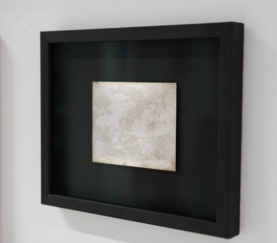 The work is from a body of work called ‘Eathquake/Event’ that is in progress. Custom pinhole cameras are installed on islands, islets and unnamed rock formations across the seismic ridge in the Mediterranean sea between what is now Greece and Turkey. A location of political tensions, migrant crossings and military operations, the cameras remain dormant, until activated by the seismic activity of the area. Each exposure is initiated, paused, continued for the duration of the earthquake. The process, like the exposure is unreliable and relies on processes that are unpredictable, but catalytic towards the formation of image. Solid Sterling silver plate etched with reduced selenium.