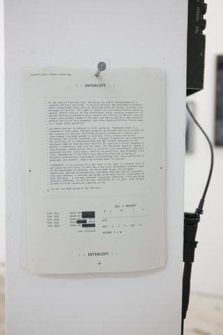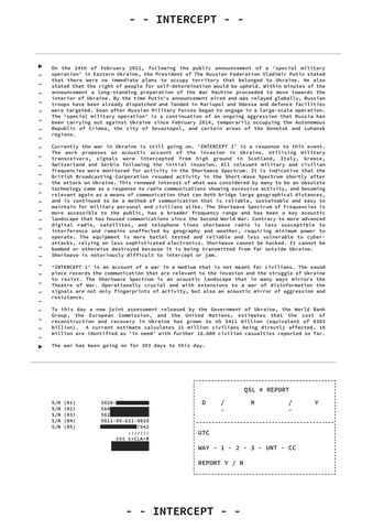 | Abstract: | Currently the war in Ukraine is still going on. ‘Intercept 1’ is a response to this event. The work proposes an acoustic account of the invasion in Ukraine. Utilising military transceivers, signals were intercepted from high ground in Scotland, Italy, Greece, Switzerland and Serbia following the initial invasion. All relevant military and civilian frequencies were monitored for activity in the Shortwave Spectrum. It is indicative that the British Broadcasting Corporation resumed activity in the Short-Wave Spectrum shortly after the attack on Ukraine. This renewed interest of what was considered by many to be an obsolete technology came as a response to radio communications showing excessive activity, and becoming relevant again as a means of communication that can both bridge large geographical distances, and is continued to be a method of communication that is reliable, sustainable and easy to maintain for military personal and civilians alike. The Shortwave Spectrum of Frequencies is more accessible to the public, has a broader frequency range and has been a key acoustic landscape that has housed communications since the Second World War. Contrary to more advanced digital radio, satellites, and telephone lines shortwave radio is less susceptible to interference and remains unaffected by geography and weather, requiring minimum power to operate. The equipment is more battel tested and reliable and less vulnerable to cyber-attacks, relying on less sophisticated electronics. Shortwave cannot be hacked. It cannot be bombed or otherwise destroyed because it is being transmitted from far outside Ukraine. Shortwave is notoriously difficult to jam. Skarbnytsya is a Glasgow based exhibition and print sale which celebrates and raises awareness of Ukrainian artists. The core values of Skarbyntsya are to bring the public’s attention to young independent creatives and artists who have been displaced by the Ukrainian-Russian War 2022 and to provide a network between these makers with creatives in Glasgow. The raised funds donated to exhibiting Ukrainian artists and Lviv National Academy of Arts |