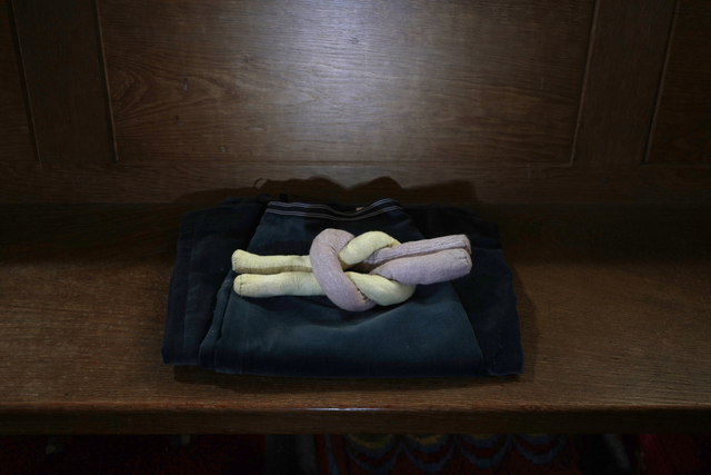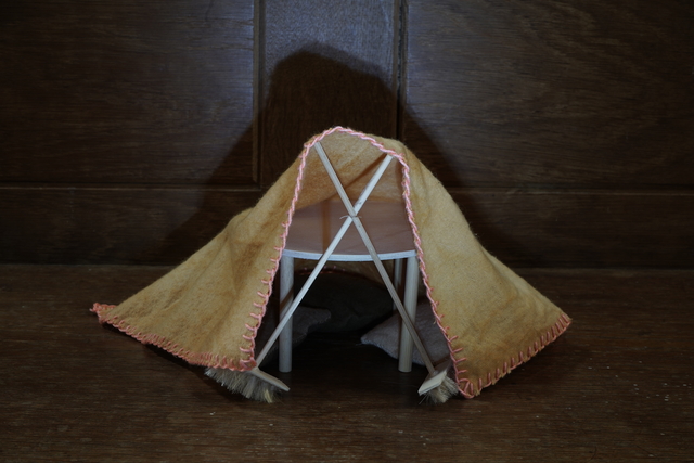 Six soft fabric sculptures resembled womb-like dens and objects reminiscent of personal nostalgia and care-giving. These were made from miniature-scaled cushions, blankets, abstract objects, and brooms made from human hair, as well as clothing heirlooms. Fabrics were dyed with kitchen waste, such as red cabbage, beetroot, onion skin and avocado stones, relating to the intensive domestic labour involved in acts of care.