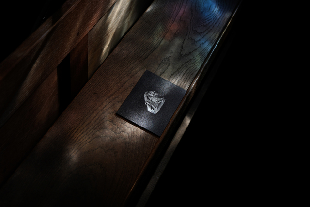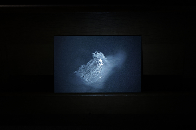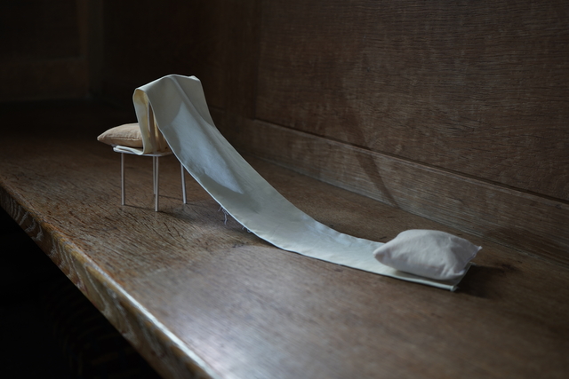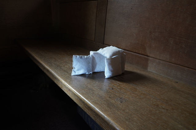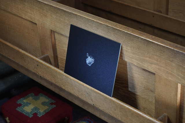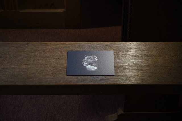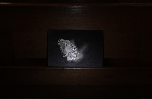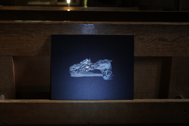 Nine direct prints on aluminium, showed inverted photographs of aluminium foil (another domestic kitchen waste), cast into hands or into bodily gestures, eg. Holding and guiding a wrist. This process creates strange otherworldly photographed forms that are both crisp and fragile. The gestures aim to record actions between individuals that are fleeting and complex, revealing the supportive, loving, frustrated and disgust involved in acts of care. Printed life-size and ‘proper’ on prayer shelves, the prints are shown as objects, presented at hand height when sitting. In their context within a church, they relate to votives left in sacred places as an offering or prayer.