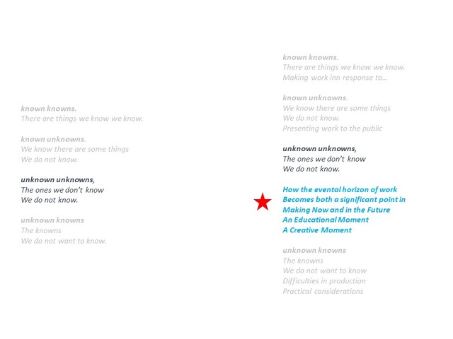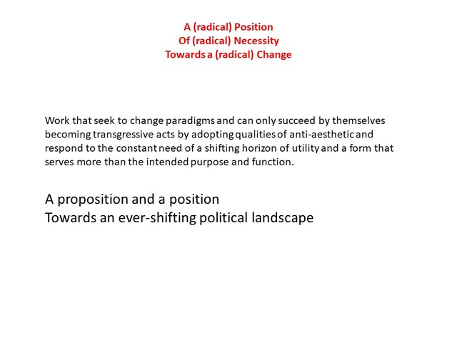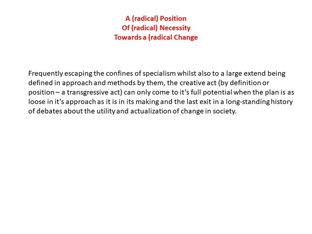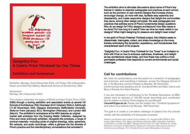 | Additional Information: | This paper was presented on 'Delightful Fun' Conference, The Glasgow School of Art, Grace & Clark Fyfe Gallery and Bourdon Lecture Theatre, 3 December 2024 -13 December 2024 This initiative celebrates the legacy of British architect Cedric Price (1934- 2003) through a touring exhibition and associated events at several UK Schools of Architecture: RGU Aberdeen (9-31 October); ESALA, Edinburgh (11-22 November); GSA, Glasgow (December); Staffordshire University, Stoke-on-Trent (January); BCU, Birmingham (February); and London Met (March). The exhibition’s centrepiece at the MSA features an original market stall prototype from the Drawing Matter Collection, designed by Price and never previously exhibited. Alongside this prototype, a range of archival materials—including prints of original drawings, texts, ephemera, film extracts, and audio recordings—offers a glimpse into the diversity of Price’s practice and the interdisciplinary conversations that animated it. In the spirit of Price’s Potteries Thinkbelt project, this initiative seeks to disseminate, interrogate, collect, and share knowledge on the move, thereby embodying the dynamism, expediency, and inclusiveness that characterised each of his projects. “Delightful Fun: A Cedric Price Thinkbelt for Our Times” is an invitation to think with Price on how to embrace usefulness, timeliness, and delight as key architectural values today, and how these may outline a more permeable profession that responds to current environmental and social challenges. The paper thinks through Cedric Price’s vision that a ‘building can accommodate an ever-shifting brief’ and applies to contemporary events. With the recent upheaval in Ukraine and Palestine the paper thinks through the most transgressive act of making and utilizes examples from contemporary fine art practice to discuss the potential and consequence in pedagogies that aspire to follow, comment and action current events. Utilising Slavoj Zizek’s ideas on the concept of the ‘unknown unknowns’ the paper proposes that there are classifications in the creative act and the pedagogies that surround them. Frequently escaping the confines of specialism whilst also to a large extend being defined in approach and methods by them, the creative act ( by definition or position – a transgressive act) can only come to it’s full potential when the plan is as loose in it’s approach as it is in its making and the last exit in a long-standing history of debates about the utility and actualization of change in society. The paper will consider current active projects that seek to change paradigms and can only succeed by themselves becoming transgressive acts by adopting qualities of anti-aesthetic and respond to the constant need of a shifting horizon of utility and a form that serves more than the intended purpose and function. |