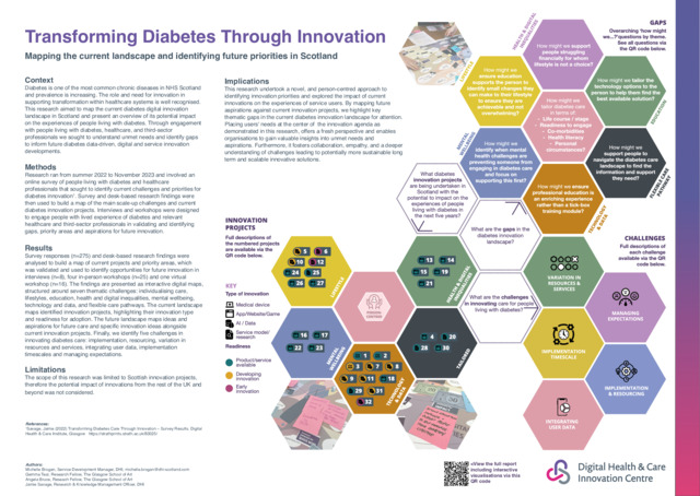 Teal, Gemma, Bruce, Angela, Brogan, Michelle and Savage, Jamie (2024) Transforming diabetes through innovation - mapping the current landscape and identifying future priorities in Scotland. In: Health Services Research UK Conference 2024, 8-10 July 2024, University of Oxford, Oxford.